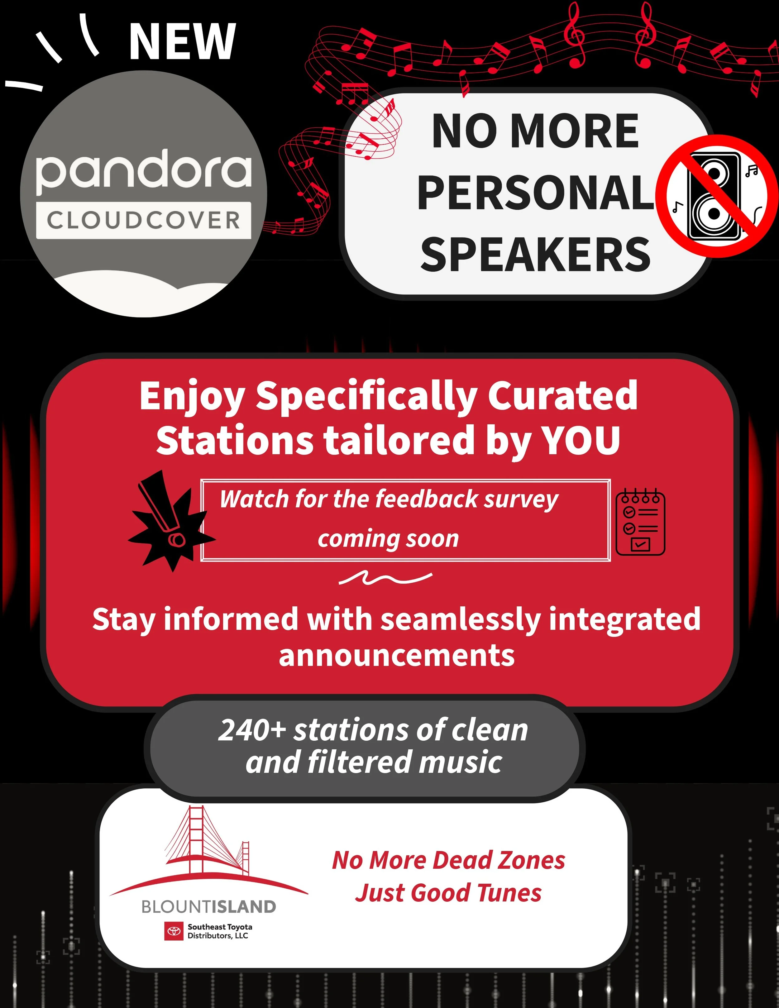 This graphic design project was created to introduce and promote the implementation of the Pandora Cloud Cover music system at the VPC. Designed for workplace display, the flyer communicates key benefits of the new system—including curated stations, improved coverage, and integrated announcements—using bold visuals, clear messaging, and strong visual hierarchy. The design supports internal communications by educating associates on the transition while reinforcing brand consistency and engaging visual storytelling.
